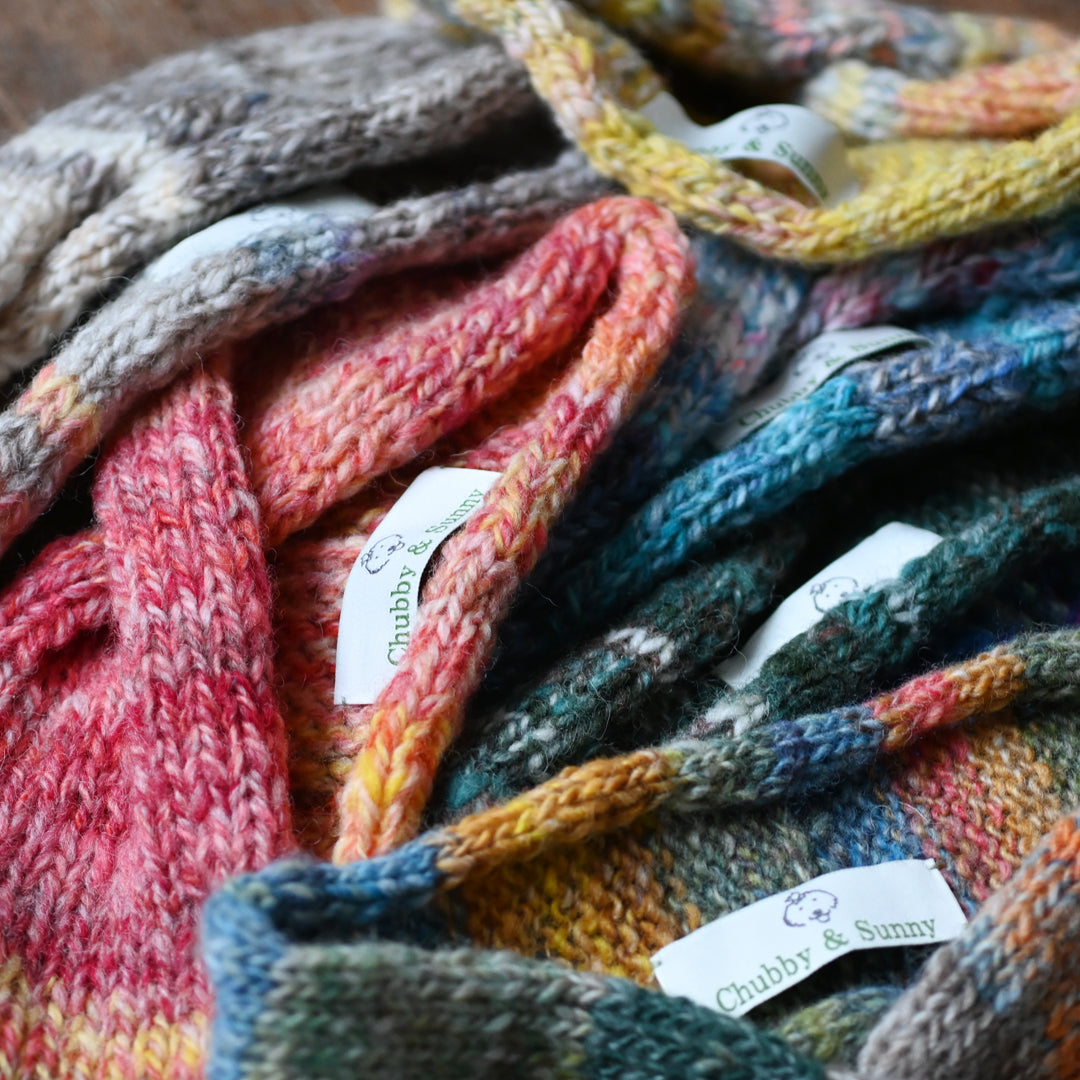 Chubby & Sunny のターバンは、寒空の下でもふんわりと心まであたためてくれる、やさしい色合いが魅力です。忙しい朝のお散歩時間も、この柔らかなターバンを身につければ、ほっと幸せなひとときに。毎日を少しだけ暖かく、美しく彩るアイテムとしておすすめです。手紡ぎの毛糸は、大量生産では生まれない特別な魅力を持つ素材です。手作業でゆっくりと紡がれるため無駄なエネルギーを使わず、牧場の羊毛や小規模な作り手を支える、環境にも優しい選択肢です。 染色された様々な種類の羊毛を紡ぐことで、色の移ろいや濃淡のゆらぎが現れ、オリジナルのグラデーションやミックスカラーが生み出す “偶然の美しさ” は唯一無二。既製品では味わえない豊かな表情が魅力です。 また、紡ぐ人の手の動きや力加減によって糸の太さや表情に微細な変化が生まれ、世界にひとつだけのラインや揺らぎが宿ります。それはまるで、作り手の温もりがそのまま糸に込められているかのよう。 手紡ぎ糸は繊維の中に空気を多く含むため、軽くてあたたかく、柔らかいのにしっかりとしたコシがある のも特徴です。編み上げると、ふんわりと自然な膨らみが生まれ、優しい肌触りを感じていただけます。